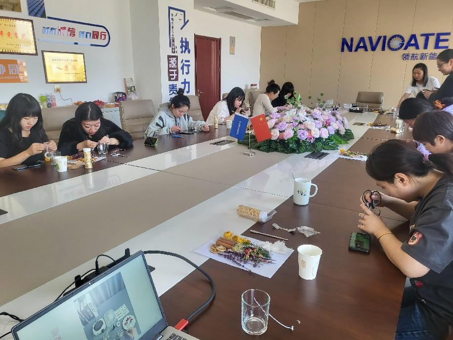 在DIY香薰蠟燭前,大家一邊聊天一邊觀看視頻學習了香薰蠟燭的制作方法,隨后開始制作香薰。先挑選干花、構思造型、融化蠟基、調配顏色、融化果凍蠟,然后等待溫度冷卻后再倒入香熏精油,最后在表層放上不同的干花修飾裝點,每一步都是別出心裁的“心靈之旅”。