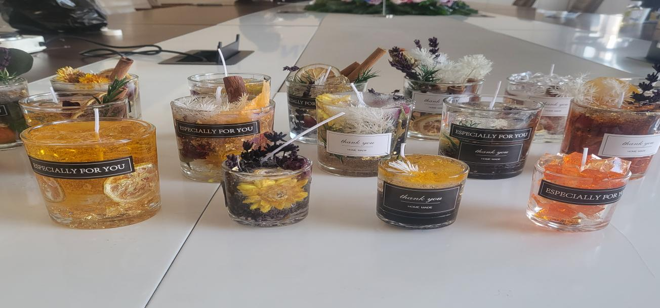大家充分發(fā)揮創(chuàng)造力,經過近一個小時的精心制作,一份份獨特的、充滿創(chuàng)意的香薰蠟燭完美的展現在我們面前。作品中香薰造型各異,也代表著大家不同的心境與體驗,鮮亮的橙色、清新的綠色、淡雅的白色,花立于杯中,或安靜或灑脫,給人以美的享受。